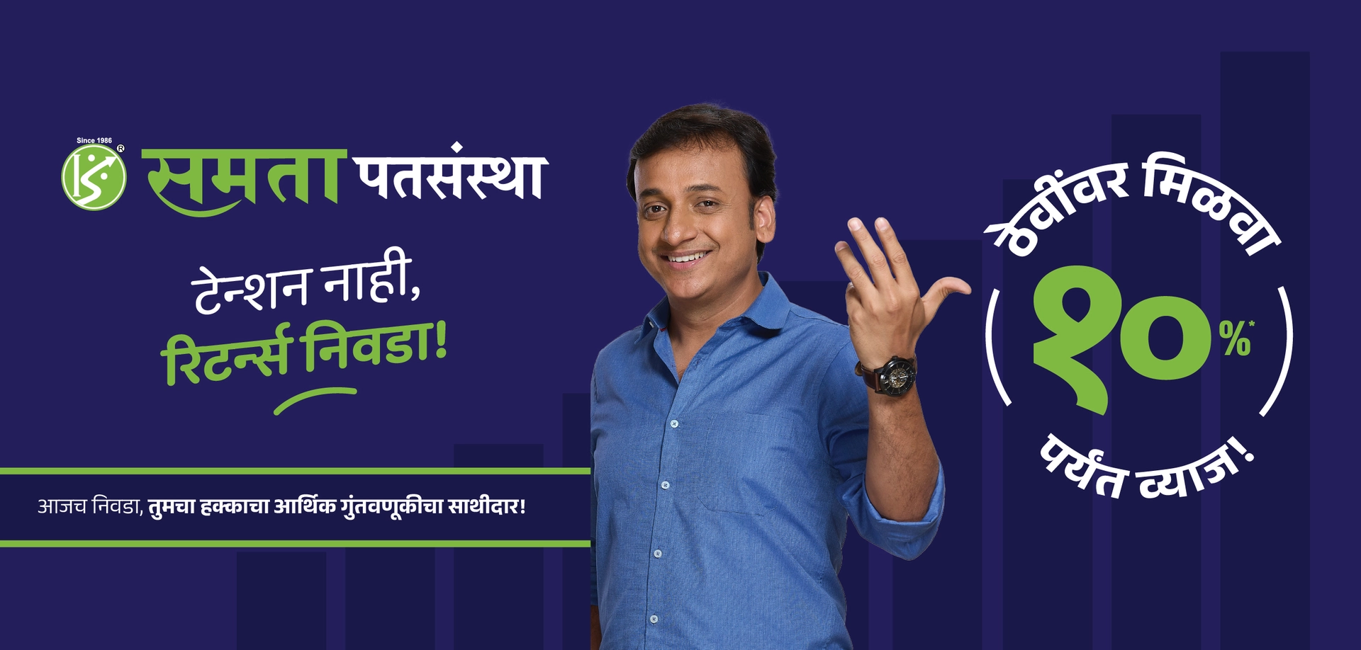 महाराष्ट्र हे सहकार चळवळीचे केंद्र आहे आणि गेली ३९ वर्ष, समता नागरी सहकारी पतसंस्था या चळवळीची मशाल घेऊन उभी आहे. कोपरगाव येथे मुख्यालय आणि २० पेक्षा अधिक शाखांच्या माध्यमातून, समता लोकांच्या मेहनतीच्या पैशावर मोठे आणि सातत्यपूर्ण परतावे देऊन त्यांचा विश्वास जपण्याचे काम करत आहे. या प्रवासात, आम्ही लोकांना योग्य आर्थिक सल्ला आणि सेवा देण्यासोबतच, बदलत्या बँकिंग क्षेत्राशी सुसंगत आधुनिक सेवा देणारी संस्था म्हणूनही ओळख निर्माण केली आहे. समतामध्ये, आम्ही दररोज आणि नेहमीच लोकांचा आमच्यावरील विश्वास दृढ करण्यासाठी कटिबद्ध आहोत.