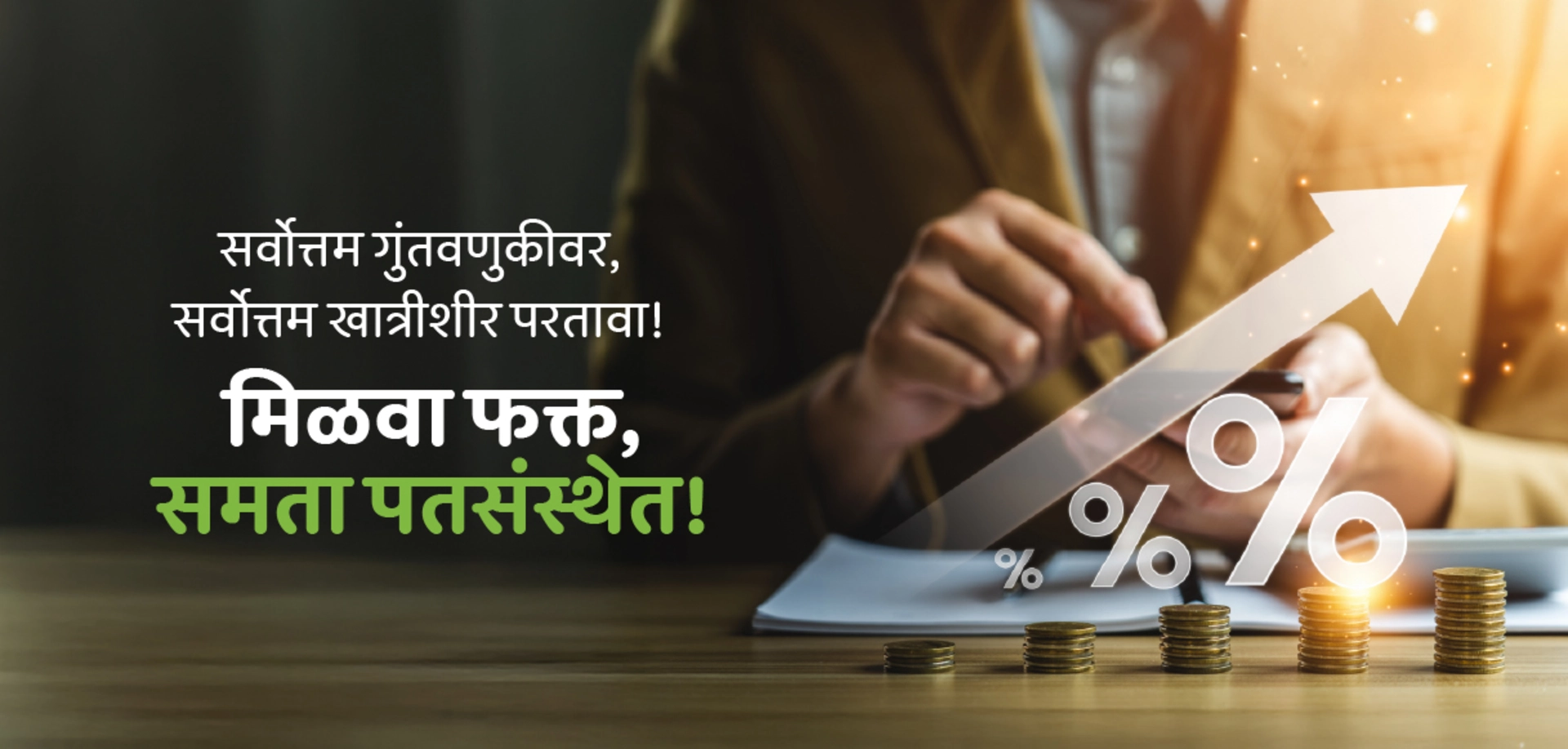 आपला व्यवसाय जितका गतिमान आहे, तितकाच विश्वासार्ह भागीदार त्याला हवा. समता करंट खाते हे कंपन्या, भागीदारी फर्म, ट्रस्ट आणि संस्थांसाठी खास डिझाइन केलेले आहे. सोपी कागदपत्रे आणि व्यवहारांमध्ये लवचिकता यामुळे दैनंदिन कामकाज अधिक सुलभ होते. आपण आपल्या व्यवसायावर लक्ष केंद्रित करा, आर्थिक व्यवस्थापन आम्ही सांभाळतो.